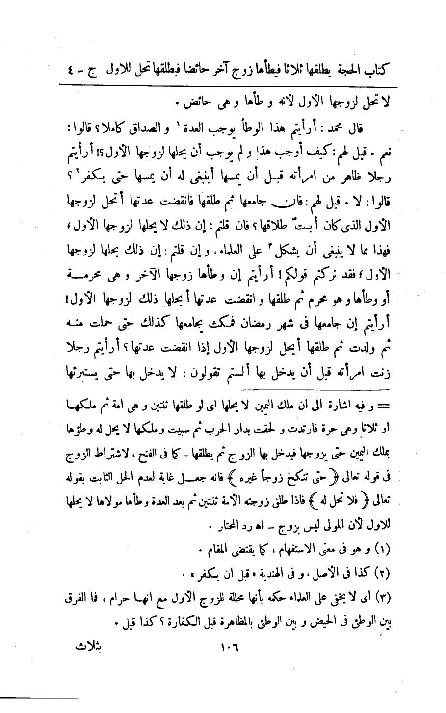 قَالَ مُحَمَّد أَرَأَيْتُم هَذَا الوطأ يُوجب الْعدة وَالصَّدَاق كَامِلا قَالُوا نعم قيل لَهُم كَيفَ أوجب هَذَا وَلم يُوجب أَن يحلهَا لزَوجهَا الاول ارايتم رجلا ظَاهر من امراته قبل ان يَمَسهَا اينبغي لَهُ ان يَمَسهَا حَتَّى يكفر قَالُوا لَا قيل لَهُم فان جَامعهَا ثمَّ طَلقهَا فانقضت عدتهَا اتحل لزَوجهَا الاول الَّذِي كَانَ ابت طَلاقهَا فان قُلْتُمْ ان ذَلِك لايحلها لزَوجهَا الاول فَهَذَا مِمَّا لَا يَنْبَغِي ان يشكل على الْعلمَاء وان قُلْتُمْ ان ذَلِك يحلهَا لزَوجهَا الاول فقد تركْتُم قَوْلكُم ارايتم ان وَطأهَا زَوجهَا الآخر وَهِي مُحرمَة اَوْ وطاها وَهُوَ محرم ثمَّ طَلقهَا وَانْقَضَت عدتهَا ايحلها ذَلِك لزَوجهَا الاول ارايتم ان جَامعهَا فِي شهر رَمَضَان فَمَكثَ يُجَامِعهَا كَذَلِك حَتَّى حملت مِنْهُ ثمَّ ولدت ثمَّ طَلقهَا ايحل لزَوجهَا الاول اذا انْقَضتْ عدتهَا ارايتم رجلا زنت امراته قبل ان يدْخل بهَا الستم تَقولُونَ لَا يدْخل بهَا حَتَّى يَسْتَبْرِئهَا
