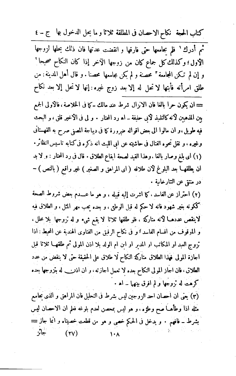 ثمَّ اِدَّرَكَ فَلم يُجَامِعهَا حَتَّى فَارقهَا وَانْقَضَت عدتهَا فان ذَلِك يحلهَا لزَوجهَا الاول وَكَذَلِكَ كل جماع كَانَ من زَوجهَا الاخر اذا كَانَ النِّكَاح صَحِيحا وان لم تكن المجامعة مُحصنَة وَلم يكن مجامعها مُحصنا وَقَالَ اهل الْمَدِينَة من طلق امراته فابتها لَا تحل لَهُ إِلَّا بعد زوج غَيره انها لَا تحل الا بعد نِكَاح