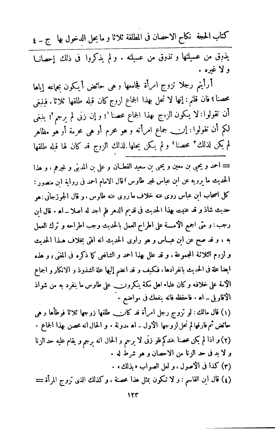 ارايتم رجلا تزوج امراة فجامعها وَهِي حَائِض ايكون بجماعه اياها مُحصنا فان قُلْتُمْ انها لَا تحل بِهَذَا الْجِمَاع لزوج كَانَ قبله طَلقهَا ثَلَاثًا فَيَنْبَغِي ان تَقولُوا لَا يكون الزَّوْج بِهَذَا الْجِمَاع مُحصنا وان زنى لم يرْجم يَنْبَغِي لكم ان تَقولُوا ان جماع امراته وَهُوَ محرم اَوْ هِيَ مُحرمَة اَوْ هُوَ مظَاهر لم يكن لذَلِك مُحصنا وَلم يكن يحلهَا لذَلِك الزَّوْج قد كَانَ لَهَا قبله طَلقهَا