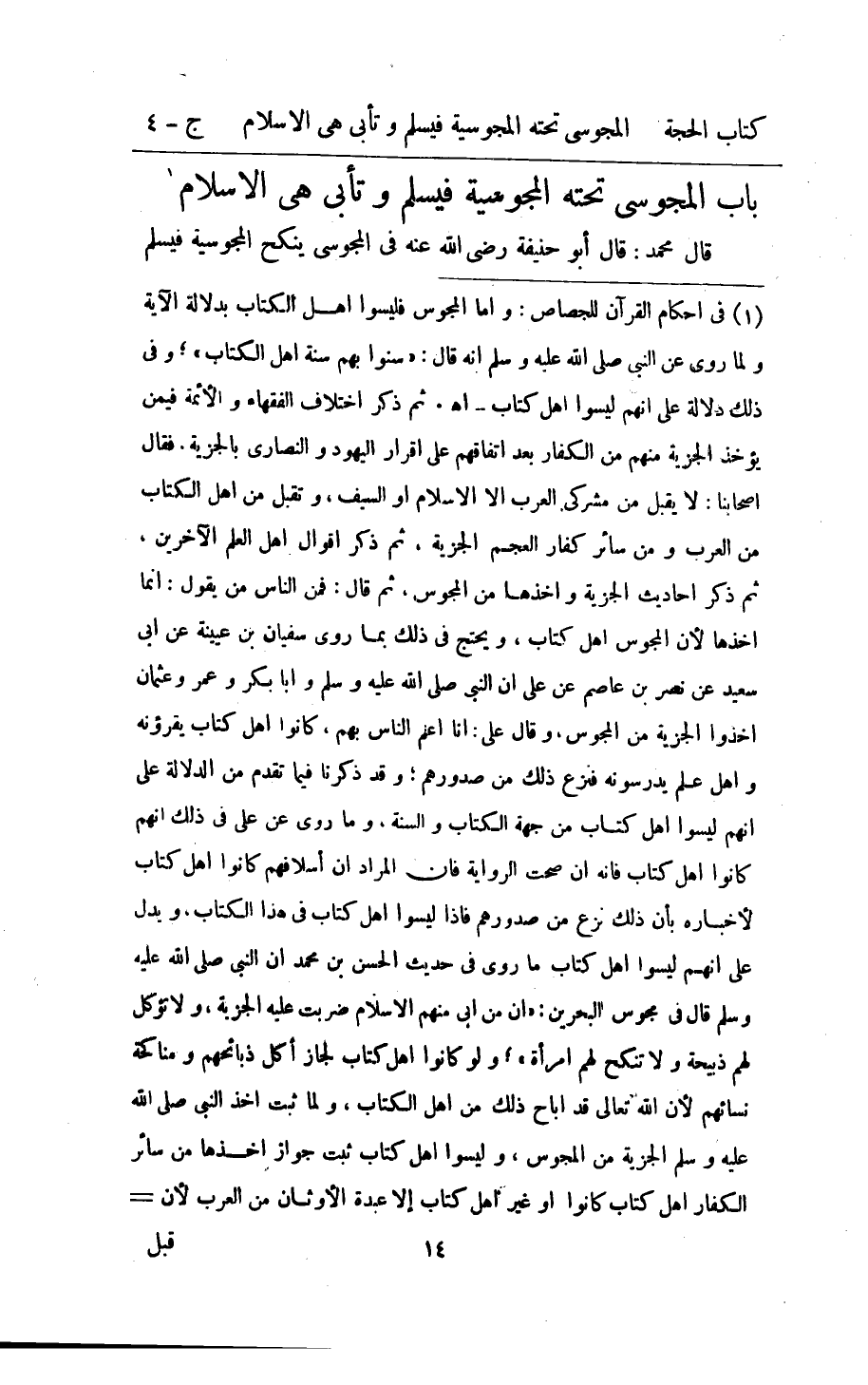 قَالَ مُحَمَّد قَالَ أَبُو حنيفَة رَضِي الله عَنهُ فِي الْمَجُوسِيّ ينْكح الْمَجُوسِيَّة فَيسلم