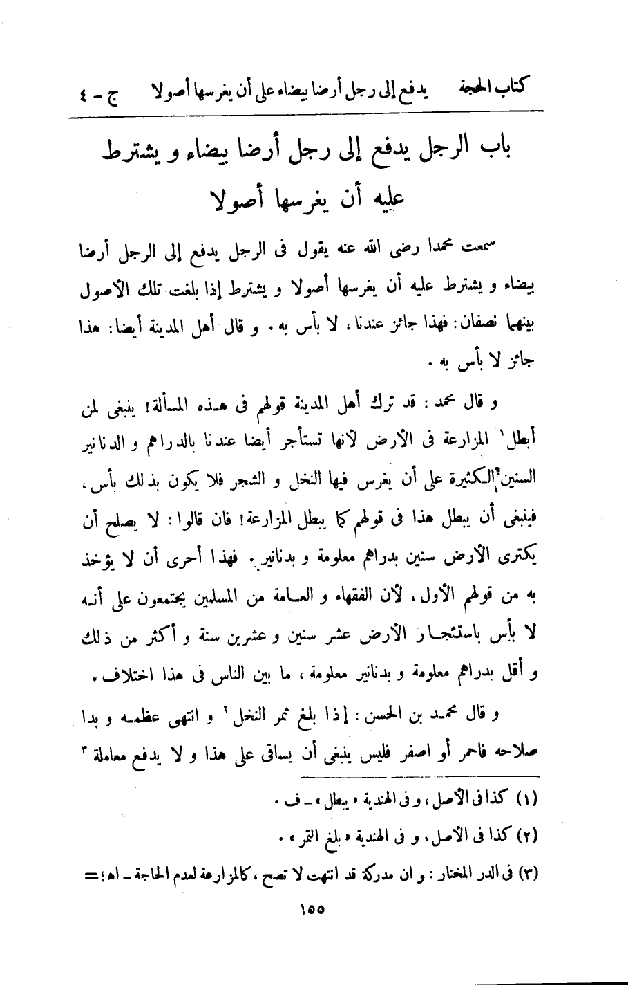 سَمِعت مُحَمَّدًا رَضِي الله عَنهُ يَقُول فِي الرجل يدْفع الى الرجل ارضا بَيْضَاء وَيشْتَرط عَلَيْهِ ان يغرسها اصولا وَيشْتَرط اذابلغت تِلْكَ الاصول بَينهمَا نِصْفَانِ فَهَذَا جَائِز عندنَا لَا باس بِهِ وَقَالَ اهل الْمَدِينَة ايضا هَذَا جَائِز لَا بَأْس بِهِ