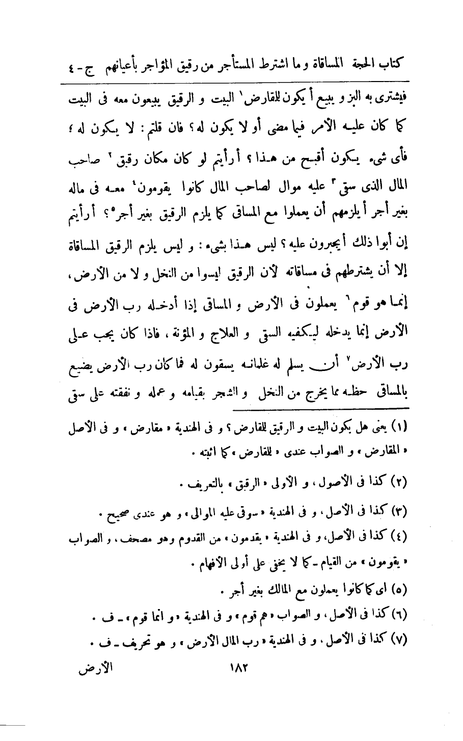 فيشتري بِهِ الْبَز وَيبِيع أَيكُون للمقارض الْبَيْت وَالرَّقِيق يبيعون مَعَه فِي الْبَيْت كَمَا كَانَ عَلَيْهِ الامر فِيمَا مضى اَوْ لَا يكون لَهُ فان قُلْتُمْ لَا يكون لَهُ فَأَي شَيْء يكون اقبح من هَذَا أَرَأَيْتُم لَو كَانَ مَكَان رَقِيق صَاحب المَال الَّذِي سقى عَلَيْهِ موَالٍ لصَاحب المَال كَانُوا يقومُونَ مَعَه فِي مَاله بِغَيْر اجْرِ أيلزمهم ان يعملوا مَعَ المساقى كَمَا يلْزم الرَّقِيق بِغَيْر اجْرِ أَرَأَيْتُم ان أَبَوا ذَلِك ايجبرون عَلَيْهِ لَيْسَ هَذَا بِشَيْء وَلَيْسَ يلْزم الرَّقِيق الْمُسَاقَاة الا ان يشترطهم فِي مساقاته لَان الرَّقِيق لَيْسُوا من النّخل وَلَا من الأَرْض انما هُوَ قوم يعْملُونَ فِي الأَرْض والمساقى اذا أدخلهُ رب الأَرْض فِي الأَرْض انما يدْخلهُ ليكفيه السقى والعلاج والمؤنة فاذا كَانَ يجب على رب الأَرْض ان يسلم لَهُ غلمانه يسقون لَهُ فَمَا كَانَ رب الأَرْض يضيع بالمساقى حَظه مِمَّا يخرج من النّخل وَالشَّجر بقيامه وَعَمله وَنَفَقَته على سقى