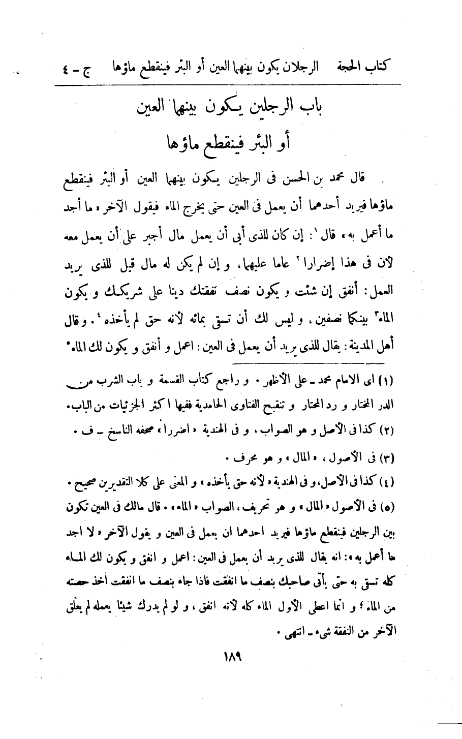 - قَالَ مُحَمَّد بن الْحسن فِي الرجلَيْن يكون بَينهمَا الْعين اَوْ الْبِئْر فَيَنْقَطِع مَاؤُهَا فيريد احدهما ان يعْمل فِي الْعين حَتَّى يخرج المَاء فَيَقُول الاخر مَا اجد مَا اعْمَلْ بِهِ قَالَ ان كَانَ للَّذي ابى يعْمل مَال اجبر على ان يعْمل مَعَه لَان فِي هَذَا اضرارا عَاما عَلَيْهِمَا وان لم يكن لَهُ مَال قيل للَّذي يُرِيد الْعَمَل انفق ان شِئْت يكون نصف نَفَقَتك دينا على شريكك وَيكون المَاء بَيْنكُمَا نِصْفَيْنِ وَلَيْسَ لَك ان تَسْقِي بمائه حق لم ياخذه وَقَالَ اهل المدنية يُقَال للَّذي يُرِيد ان يعْمل فِي الْعين اعْمَلْ وانفق وَيكون لَك المَاء