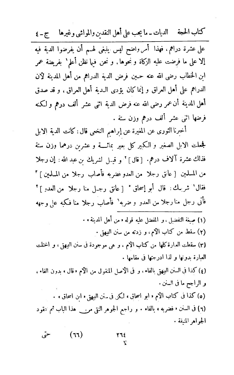 اُخْبُرْنَا الثَّوْريّ عَن الْمُغيرَة عَن ابراهيم النَّخعِيّ قَالَ كَانَت الدِّيَة الابل فَجعلت الابل الصَّغِير وَالْكَبِير كل بعير بِمِائَة وَعشْرين دِرْهَم وزن سِتَّة فَذَلِك عشرَة الاف دِرْهَم وَقيل لِشَرِيك بن عبد الله ان رجلا من الْمُسلمين عانق رجلا من الْعَدو فَضَربهُ فاصاب رجلا من الْمُسلمين فَقَالَ شريك قَالَ ابو اسحاق عانق رجل منا رجل من الْعَدو فاتى رجل منا رجل من الْعَدو وضربه فاصاب رجلا منا فكبه على وَجهه