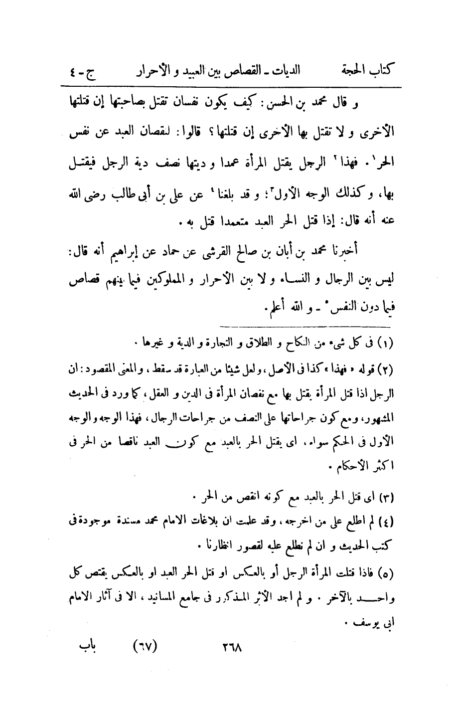 وَقَالَ مُحَمَّد بن الْحسن كَيفَ يكون نفسان تقتل بصاحبتها ان قتلتها الاخرى وَلَا تقتل بهَا الاخرى ان قتلتها قَالُوا لنُقْصَان العَبْد عَن نفس الْحر فَهَذَا الرجل يقتل الْمَرْأَة عمدا وديتها نصف دِيَة الرجل فَيقْتل بهَا وَكَذَلِكَ الْوَجْه الأول وَقد بلغنَا عَن عَليّ بن ابي طَالب رَضِي الله عَنهُ انه قَالَ اذا قتل الْحر العَبْد مُتَعَمدا قتل بِهِ