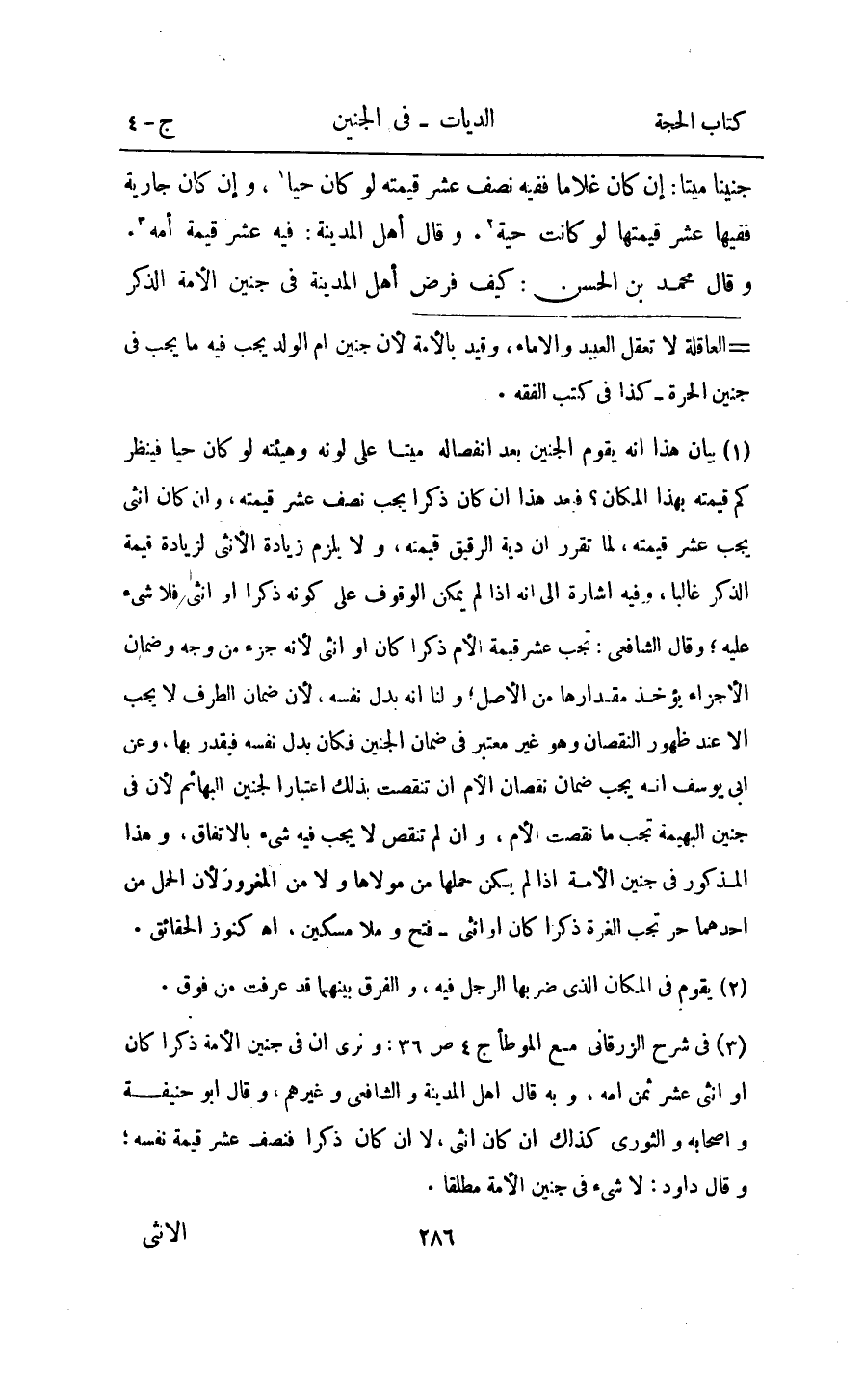 جَنِينا مَيتا ان كَانَ غُلَاما فَفِيهِ نصف عشر قِيمَته لَو كَانَ حَيا وَإِن كَانَ جَارِيَة فَفِيهَا عشر قيمتهَا لَو كَانَت حَيَّة وَقَالَ اهل الْمَدِينَة فِيهِ عشر قيمَة امهِ وَقَالَ مُحَمَّد بن الْحسن كَيفَ فرض اهل الْمَدِينَة فِي جَنِين الامة الذّكر