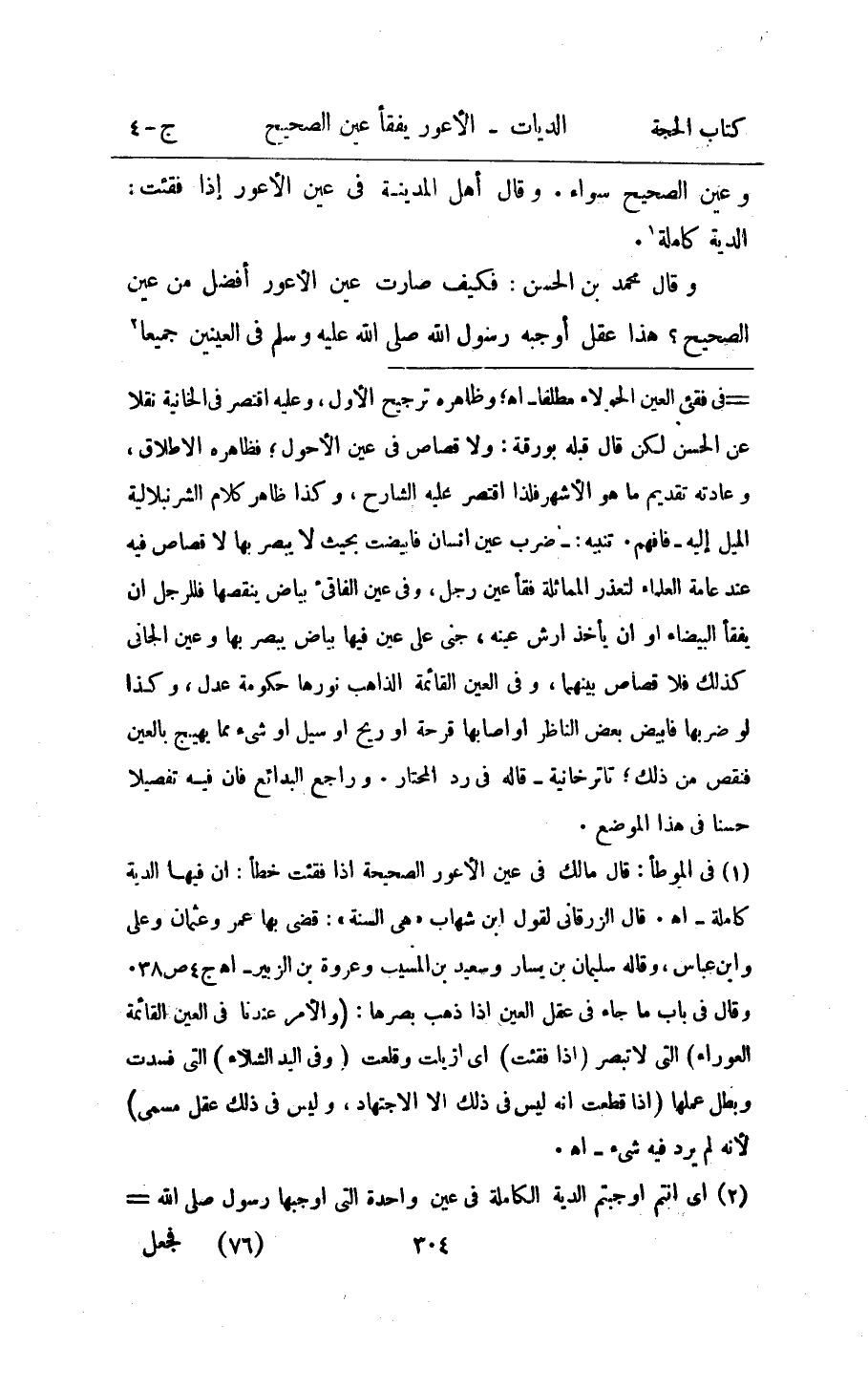 وَقَالَ مُحَمَّد بن الْحسن فَكيف صَارَت عين الاعور افضل من عين الصَّحِيح هَذَا عقل اوجبه رَسُول الله صلى الله عَلَيْهِ وَسلم فِي الْعَينَيْنِ جَمِيعًا