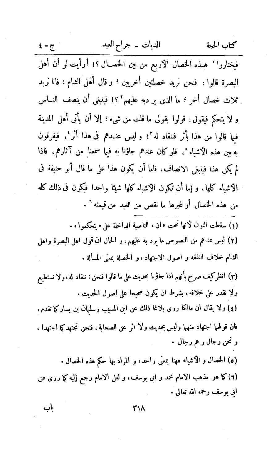 فيختاروا هَذِه الْخِصَال الاربع من بَين الْخِصَال ارايت لَو ان اهل الْبَصْرَة قَالُوا فَنحْن نُرِيد خَصْلَتَيْنِ اخريين وَقَالَ اهل الشَّام فانا نُرِيد ثَلَاث خِصَال اخر مَا الَّذِي يرد بِهِ عَلَيْهِم فَيَنْبَغِي ان ينصف النَّاس وَلَا يتحكم فَيَقُول قُولُوا بِقَوْلِي مَا قلت من شَيْء الا ان يأتى اهل الْمَدِينَة فِيمَا قَالُوا من هَذَا بأثر فنقاد لَهُ وَلَيْسَ عِنْدهم فِي هَذَا أثر فيفرقون بِهِ بَين هَذِه الْأَشْيَاء فَلَو كَانَ عِنْدهم جاؤنا بِهِ فِيمَا سمعنَا من اثارهم فاذا لم يكن هَذَا فَيَنْبَغِي الانصاف فاما ان يكون هَذَا على مَا قَالَ ابو حنيفَة فِي الْأَشْيَاء كلهَا وَإِمَّا أَن تكون الْأَشْيَاء كلهَا شَيْئا وَاحِدًا فَيكون فِي ذَلِك كُله من هَذِه الْخِصَال اوغيرها مَا نقص من العَبْد من قِيمَته