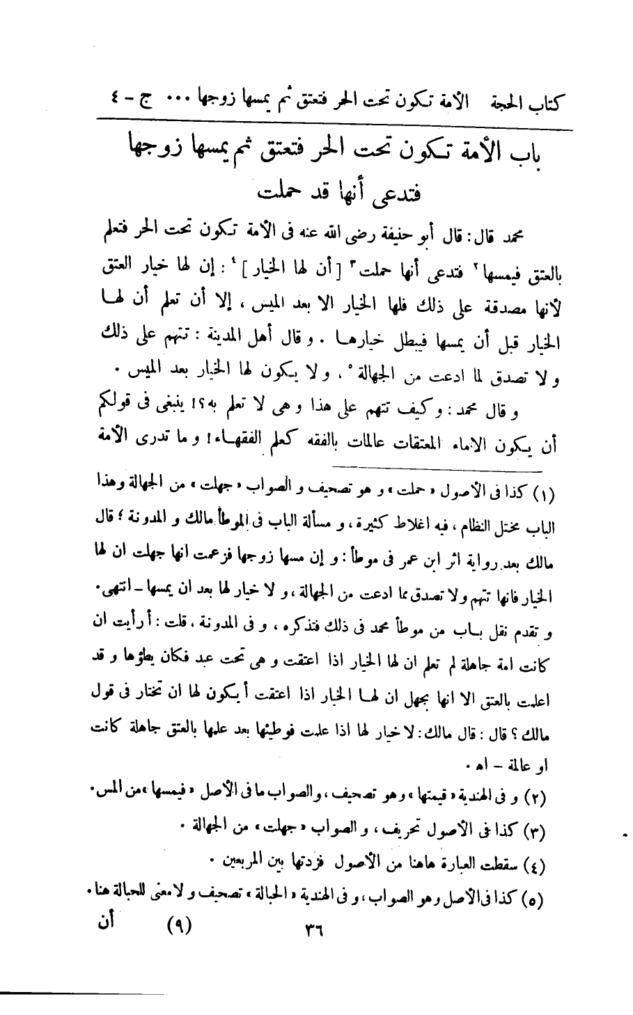 مُحَمَّد قَالَ قَالَ ابو حنيفَة رَضِي الله عَنهُ فِي الْأمة تكون تَحت الْحر فتعلم بِالْعِتْقِ فيسمها فَتُدْعَى انها حملت ان لَهَا الْخِيَار ان لَهَا خِيَار الْعتْق لانها مصدقة على ذَلِك فلهَا الْخِيَار الا بعد الميس الا ان تعلم ان لَهَا الْخِيَار قبل ان يَمَسهَا فَيبْطل خِيَارهَا وَقَالَ اهل الْمَدِينَة تتهم على ذَلِك وَلَا تصدق لما ادَّعَت من الْجَهَالَة وَلَا يكون لَهَا الْخِيَار بعد الميس
