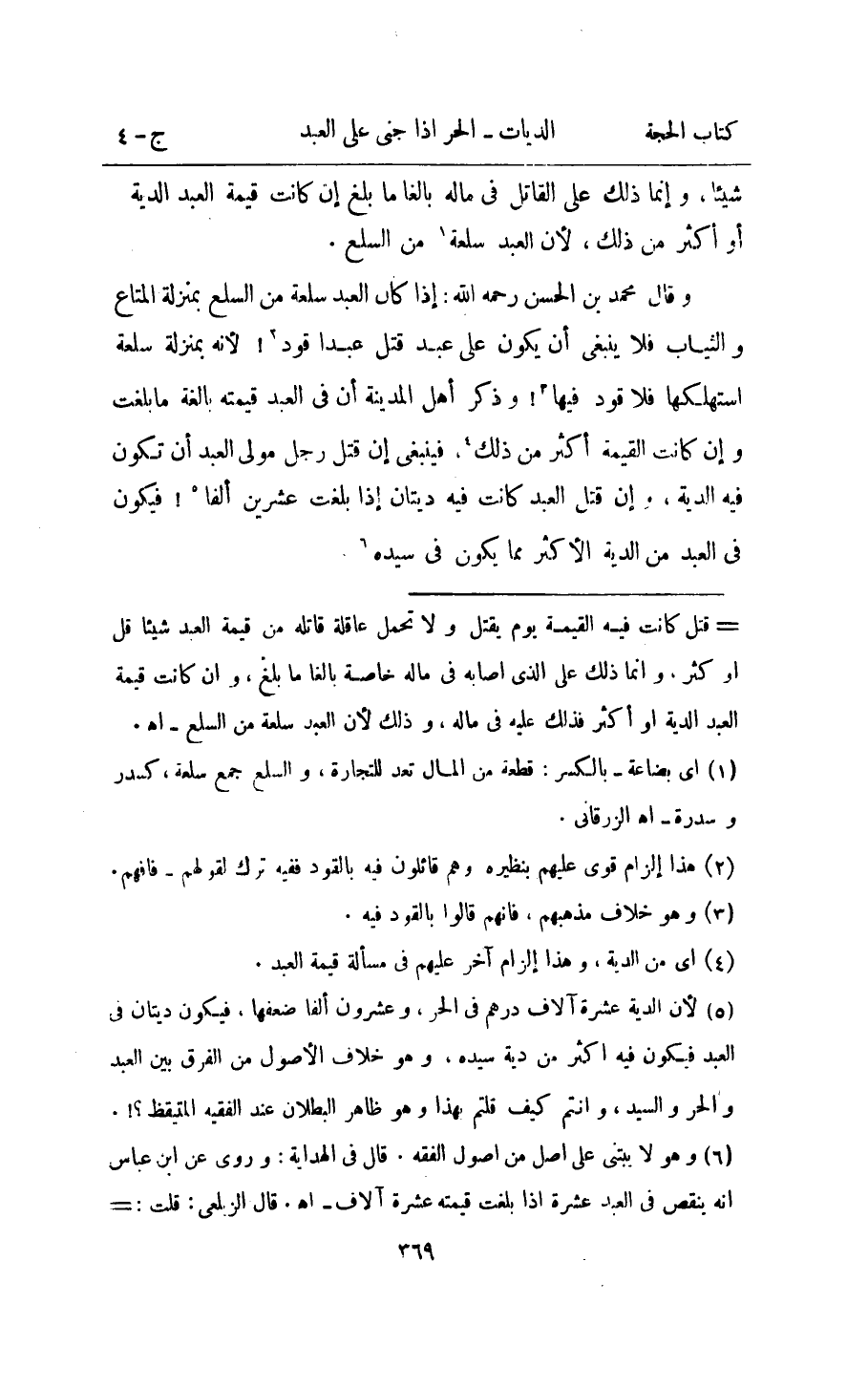 وَقَالَ مُحَمَّد بن الْحسن رَحمَه الله اذا كَانَ العَبْد سلْعَة من السّلع بِمَنْزِلَة الْمَتَاع وَالثيَاب فَلَا يَنْبَغِي ان يكون على عبد قتل عبدا قَود لانه بِمَنْزِلَة سلْعَة استهلكها فَلَا قَود فِيهَا وَذكر اهل الْمَدِينَة ان فِي العَبْد قِيمَته بَالِغَة مَا بلغت وان كَانَت الْقيمَة اكثر من ذَلِك فَيَنْبَغِي ان قتل رجل مولى العَبْد ان تكون فِيهِ الدِّيَة ان قتل العَبْد كَانَت فِيهِ ديتان اذا بلغت عشْرين الْفَا فَيكون فِي العَبْد من دِيَة الاكثر مِمَّا يكون فِي سَيّده