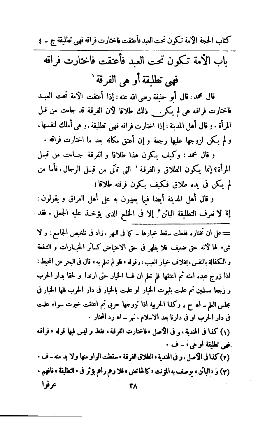 قَالَ مُحَمَّد قَالَ أَبُو حنيفَة رَضِي الله عَنهُ اذا اعتقت الْأمة تَحت العَبْد فَاخْتَارَتْ فراقة هِيَ لم يكن ذَلِك طَلَاقا لِأَن الْفرْقَة قد جَاءَت من قبل الْمَرْأَة وَقَالَ اهل الْمَدِينَة اذا اخْتَارَتْ فِرَاقه فَهِيَ تَطْلِيقَة وَهِي املك لنَفسهَا وَلم يكن لزَوجهَا عَلَيْهَا رَجْعَة وان اعْتِقْ مَكَانَهُ بَعْدَمَا اخْتَارَتْ فِرَاقه