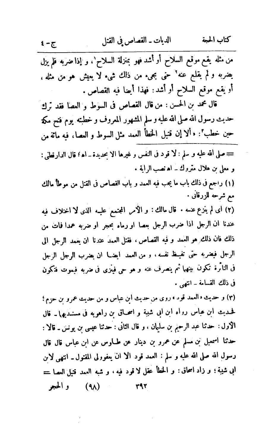 قَالَ مُحَمَّد بن الْحسن من قَالَ الْقصاص فِي السَّوْط والعصا فقد ترك حَدِيث رَسُول الله صلى الله عَلَيْهِ وَسلم الْمَشْهُور الْمَعْرُوف وخطبته يَوْم فتح مَكَّة حِين خطب الا ان قَتِيل الخطا الْعمد مثل السَّوْط والعصا فِيهِ مائَة من