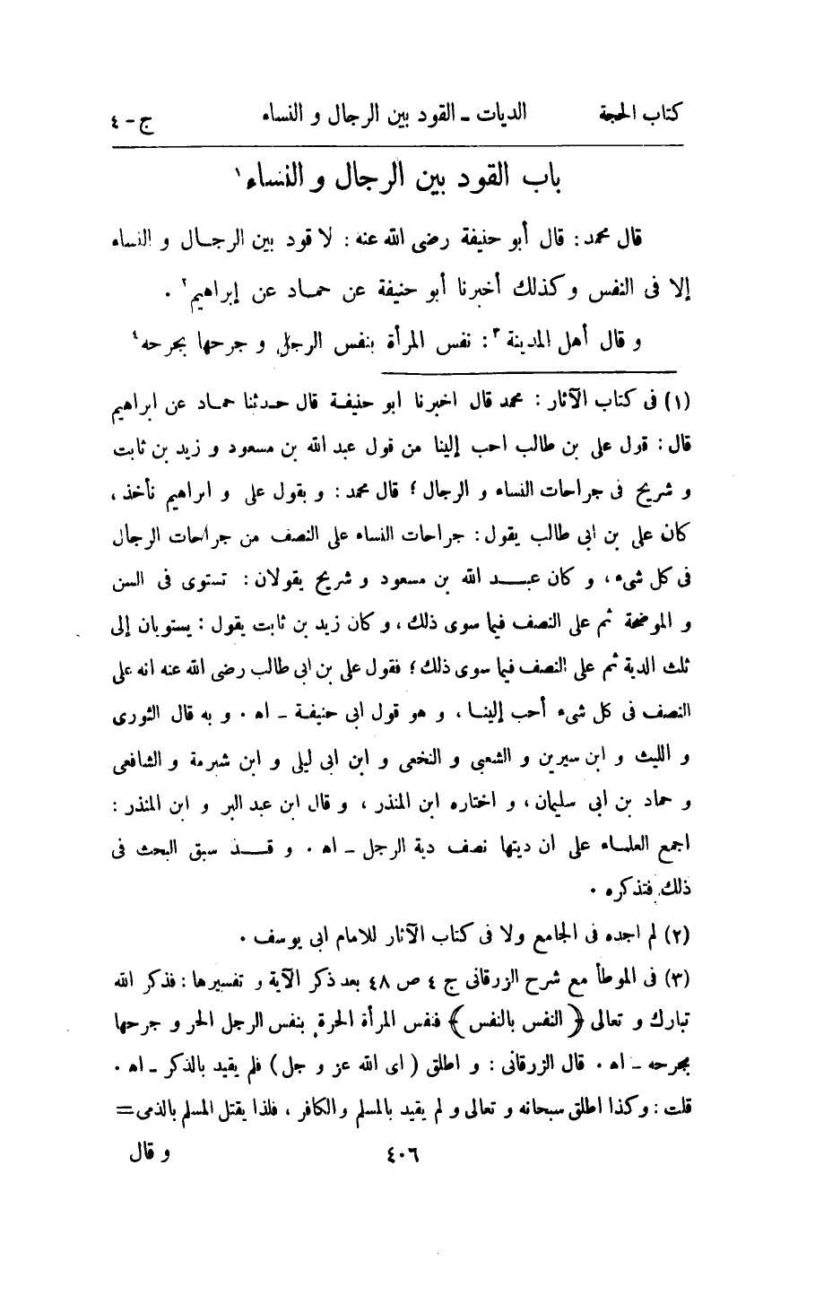 قَالَ مُحَمَّد قَالَ ابو حنيفَة رَضِي الله عَنهُ لَا قَود بَين الرِّجَال وَالنِّسَاء الا فِي النَّفس وَكَذَلِكَ اُخْبُرْنَا ابو حنيفَة عَن حَمَّاد عَن ابراهيم