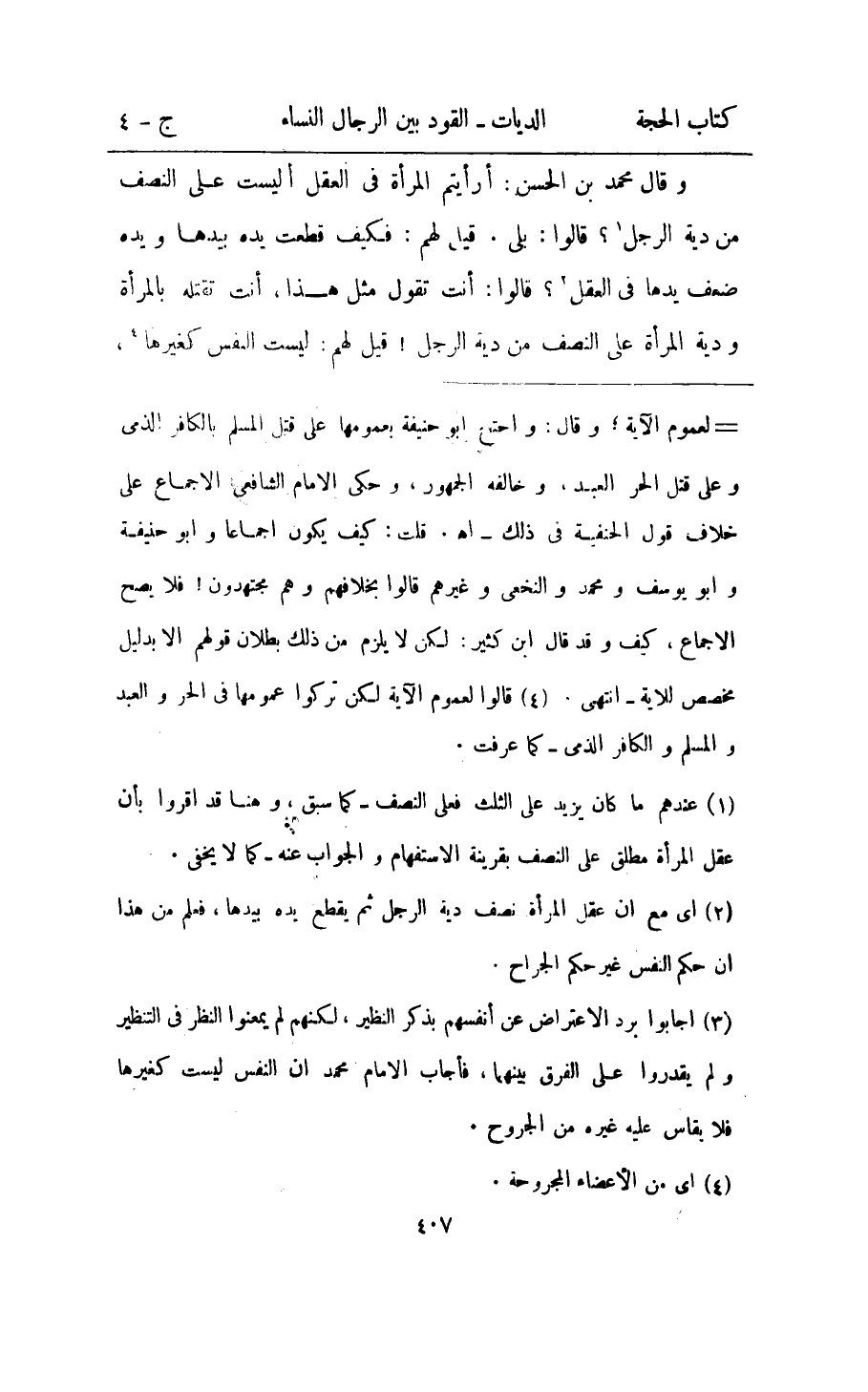 وَقَالَ مُحَمَّد بن الْحسن ارايتم المراة فِي الْعقل اليست على النّصْف من دِيَة الرجل قَالُوا بلَى قيل لَهُم فَكيف قطعت يَده بِيَدِهَا وَيَده ضعف يَدهَا فِي الْعقل قَالُوا انت تَقول مثل هَذَا انت تقتله بالمراة ودية المراة على النّصْف من دِيَة الرجل قيل لَهُم لَيست النَّفس كَغَيْرِهَا