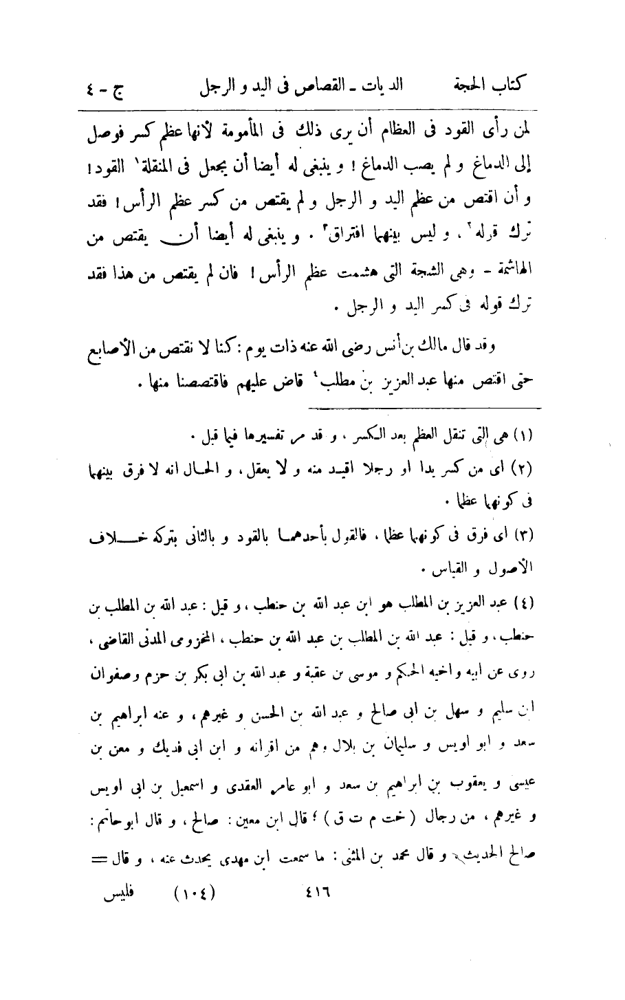 وَقد قَالَ مَالك بن انس رضى الله عَنهُ ذَات يَوْم كُنَّا لَا نقتص من الاصابع حَتَّى اقْتصّ مِنْهَا عبد الْعَزِيز بن مطلب قَاض عَلَيْهِم فاقتصصنا مِنْهَا