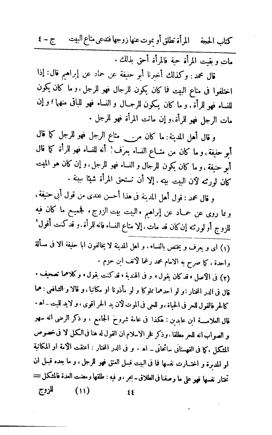 وَقَالَ مُحَمَّد قَول اهل الْمَدِينَة فِي هَذَا احسن عِنْدِي من قَول ابي حنيفَة وَمِمَّا روى عَن حَمَّاد عَن ابراهيم الْبَيْت بَيت الزَّوْج فَجَمِيع مَا كَانَ فِيهِ للزَّوْج اَوْ لوَرثَته ان كَانَ قد مَاتَ الا مَتَاع النِّسَاء فانه للْمَرْأَة وَقد كنت اقول