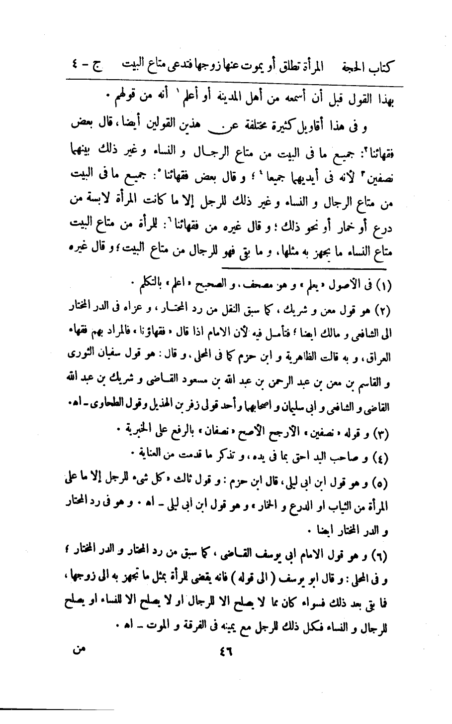 وَفِي هَذَا أقاويل كَثِيرَة مُخْتَلفَة عَن هذَيْن الْقَوْلَيْنِ ايضا قَالَ بعض فقهائنا جَمِيع مَا فِي الْبَيْت من مَتَاع الرِّجَال وَالنِّسَاء وَغير ذَلِك بَينهمَا نِصْفَيْنِ لانه فِي ايديهما جَمِيعًا وَقَالَ بعض فقهائنا جَمِيع مَا فِي الْبَيْت من مَتَاع الرِّجَال وَالنِّسَاء وَغير ذَلِك للرجل الا مَا كَانَت المراة لابسة من درع اَوْ خمار اَوْ نَحْو ذَلِك وَقَالَ غَيره من فقهائنا للْمَرْأَة من مَتَاع الْبَيْت مَتَاع النِّسَاء مَا يُجهز بِهِ مثلهَا وَمَا بَقِي فَهُوَ للرِّجَال من مَتَاع الْبَيْت وَقَالَ غَيره