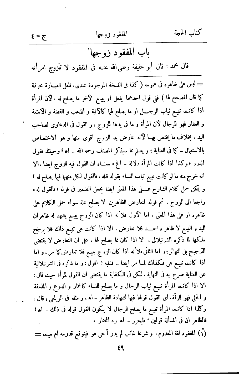 قَالَ مُحَمَّد قَالَ ابو حنيفَة رَضِي الله عَنهُ فِي الْمَفْقُود لَا تتَزَوَّج امْرَأَته