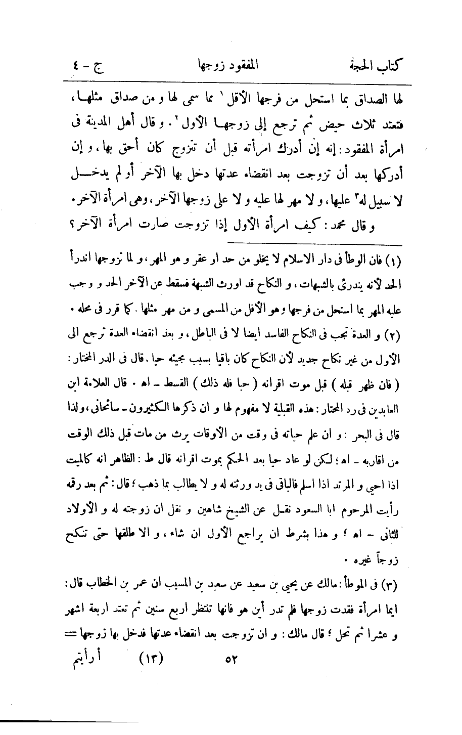 لَهَا الصَدَاق بِمَا اسْتحلَّ من فرجهَا الاقل مِمَّا سمى لَهَا وَمن صدَاق مثلهَا فَتعْتَد ثَلَاث حيض ثمَّ ترجع الى زَوجهَا الأول وَقَالَ اهل الْمَدِينَة فِي امْرَأَة الْمَفْقُود انه ان اِدَّرَكَ امْرَأَته قبل ان تتَزَوَّج كَانَ احق بهَا وان ادركها بعد ان تزوجت بعد انْقِضَاء عدتهَا دخل بهَا الاخر اَوْ لم يدْخل لَا سَبِيل لَهُ عَلَيْهَا وَلَا مهر لَهَا عَلَيْهِ وَلَا على زَوجهَا الآخر وَهِي امْرَأَة الاخر