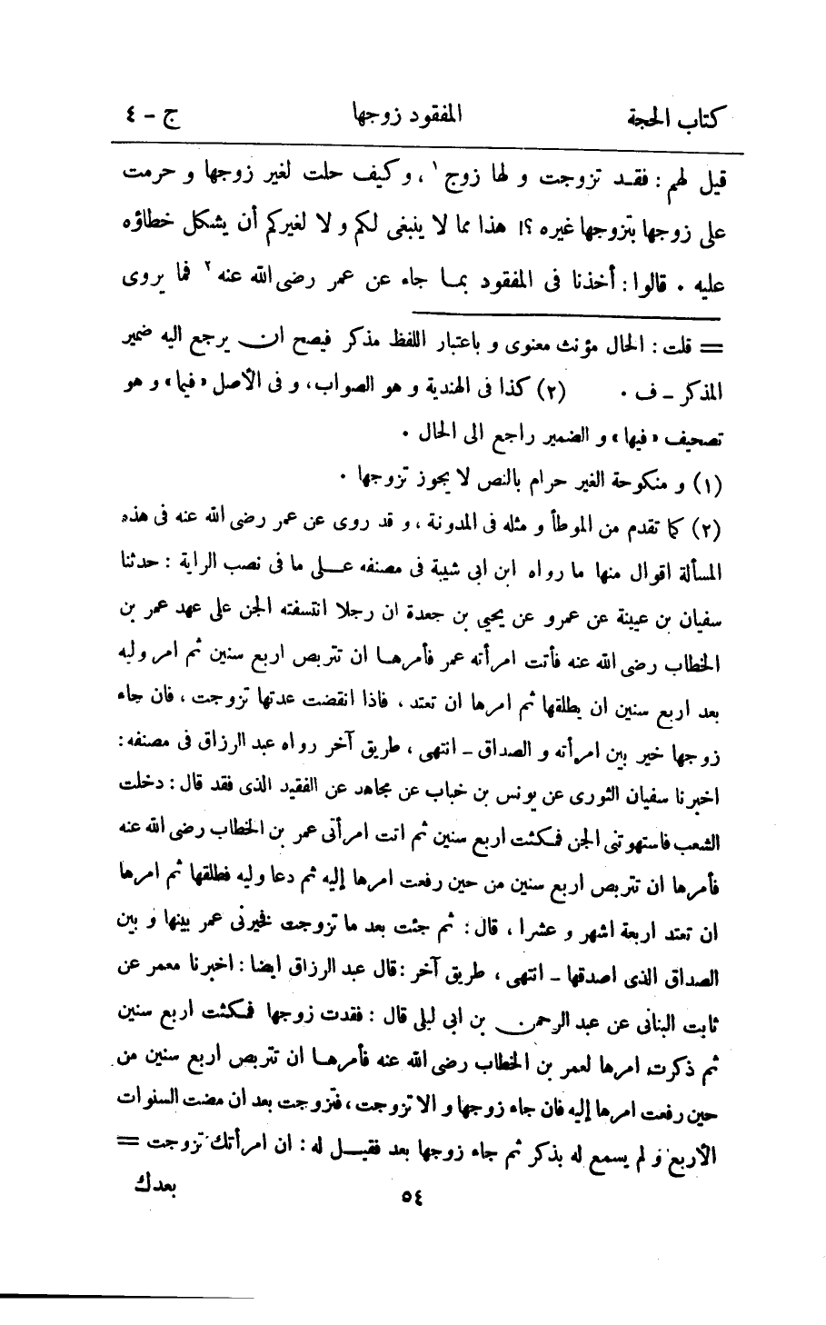 قيل لَهُم فقد تزوجت وَلها زوج وَكَيف حلت لغير زَوجهَا وَحرمت على زَوجهَا بتزوجها غَيره هَذَا مِمَّا لَا يَنْبَغِي لكم وَلَا لغيركم ان يشكل خطاؤه عَلَيْهِ قَالُوا اخذنا فِي الْمَفْقُود بِمَا جَاءَ عَن عمر رَضِي الله عَنهُ فَمَا يرْوى