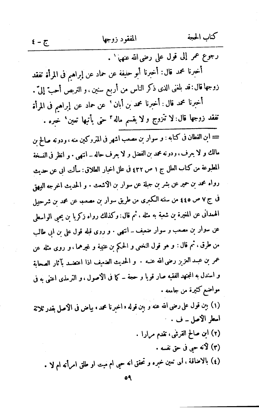 اُخْبُرْنَا مُحَمَّد قَالَ اُخْبُرْنَا ابو حنيفَة عَن حَمَّاد عَن ابراهيم فِي الْمَرْأَة تفقد زَوجهَا قَالَ قد بلغنى الَّذِي ذكر النَّاس من أَربع سِنِين والتربص احب الي