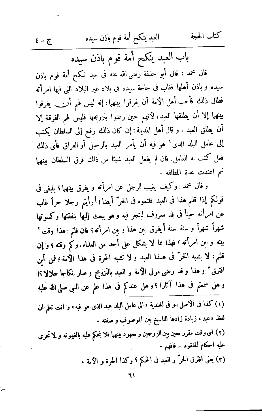قَالَ مُحَمَّد قَالَ ابو حنيفَة رَضِي الله عَنهُ فِي عبد نكح امة قوم باذن سَيّده وباذن اهلها فَغَاب فِي حَاجَة سَيّده فِي بِلَاد غير الْبِلَاد الَّتِي فِيهَا امْرَأَته فطال ذَلِك فَأحب اهل الامة ان يفرقُوا بَينهمَا انه لَيْسَ لَهُم ان يفرقُوا بَينهمَا الا ان يطلقهَا العَبْد لانهم حِين رَضوا بتزويجها فَلَيْسَ لَهُم الْفرْقَة الا ان يُطلق العَبْد وَقَالَ اهل الْمَدِينَة ان كَانَ ذَلِك رفع الى السُّلْطَان يكْتب الى عَامل الْبَلَد الَّذِي هُوَ فِيهِ ان يَأْمر العَبْد بالرحيل اَوْ الْفِرَاق فَأَي ذَلِك فعل كتب بِهِ الْعَامِل فان لم يفعل العَبْد شَيْئا من ذَلِك فرق السُّلْطَان بَينهمَا ثمَّ اعْتدت عدَّة الْمُطلقَة