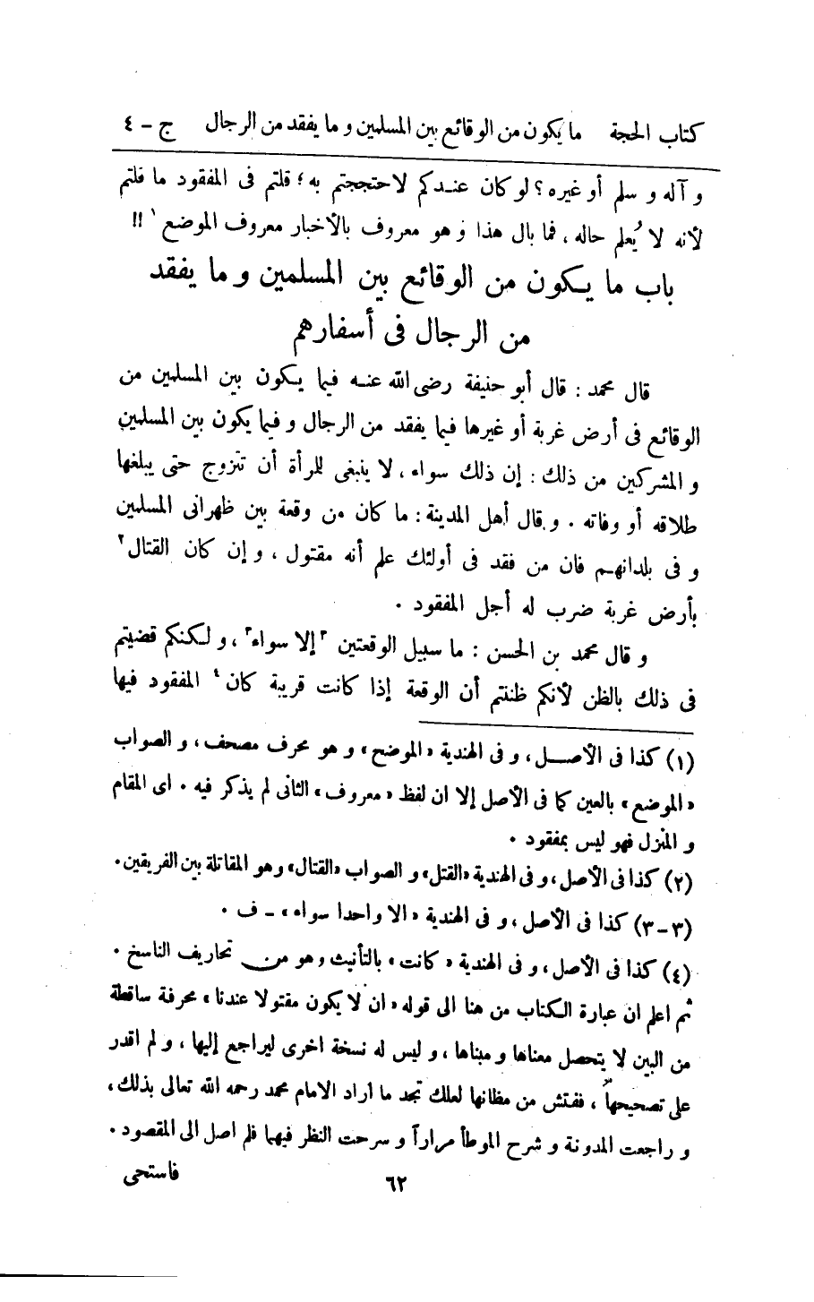 قَالَ مُحَمَّد قَالَ ابو حنيفَة رَضِي الله عَنهُ فِيمَا يكون بَين الْمُسلمين من الوقائع فِي ارْض غربَة اَوْ غَيرهَا فِيمَا يفقد من الرِّجَال وَفِيمَا يكون بَين الْمُسلمين وَالْمُشْرِكين من ذَلِك ان ذَلِك سَوَاء لَا يَنْبَغِي للْمَرْأَة ان تتَزَوَّج حَتَّى يبلغهَا طَلَاقه اَوْ وَفَاته وَقَالَ اهل الْمَدِينَة مَا كَانَ من وقْعَة بَين ظهراني الْمُسلمين وَفِي بلدانهم فان من فقد فِي اولئك علم انه مقتول وان كَانَ الْقِتَال بِأَرْض غربَة ضرب لَهُ اجل الْمَفْقُود