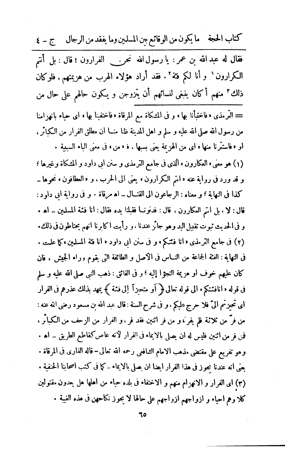 فَقَالَ لَهُ عبد الله بن عمر يَا رَسُول الله نَحن الْفَرَّارُونَ قَالَ بل انتم الكرارون وانا لكم فِئَة فقد اراد هَؤُلَاءِ الْهَرَب من هزيمتهم فَلَو كَانَ ذَلِك مِنْهُم أَكَانَ يَنْبَغِي لنسائهم ان يتزوجن وَيكون حَالهم على حَال من
