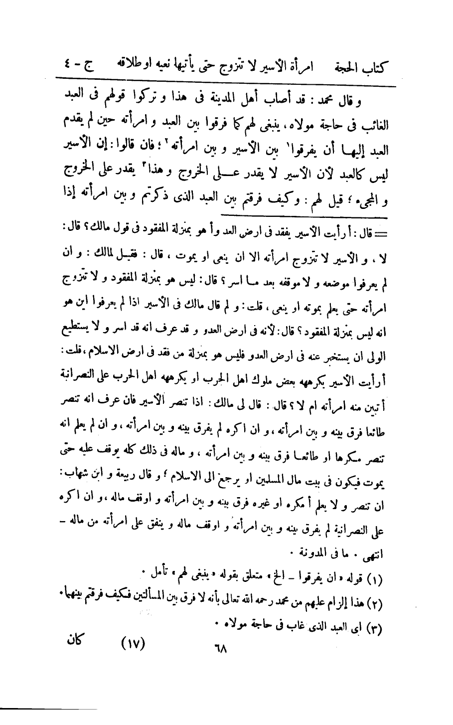 وَقَالَ مُحَمَّد قد اصاب اهل الْمَدِينَة فِي هَذَا وَتركُوا قَوْلهم فِي العَبْد الْغَائِب فِي حَاجَة مَوْلَاهُ يَنْبَغِي لَهُم كَمَا فرقوا بَين العَبْد وَامْرَأَته حِين لم يقدم العَبْد اليها ان يفرقُوا بَين الاسير وَبَين امراته فان قَالُوا ان الاسير لَيْسَ كَالْعَبْدِ لَان الاسير لَا يقدر على الْخُرُوج وَهَذَا يقدر على الْخُرُوج والمجيء قيل ل لَهُم وَكَيف فرقتم بَين العَبْد الَّذِي ذكرْتُمْ وَبَين امْرَأَته اذا