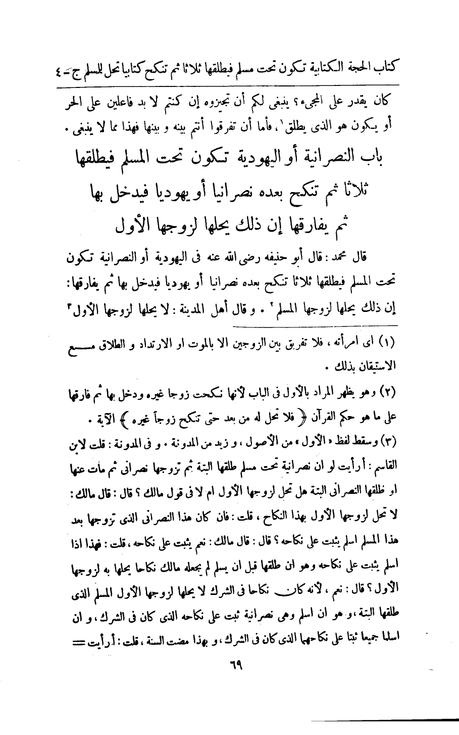 قَالَ مُحَمَّد قَالَ ابو حنيفَة رَضِي الله عَنهُ فِي الْيَهُودِيَّة اَوْ النَّصْرَانِيَّة تكون تَحت الْمُسلم فيطلقها ثَلَاثًا تنْكح بعده نَصْرَانِيّا اَوْ يَهُودِيّا فَيدْخل بهَا ثمَّ يفارقها ان ذَلِك يحلهَا لزَوجهَا الْمُسلم وَقَالَ اهل الْمَدِينَة لَا يحلهَا لزَوجهَا الأول