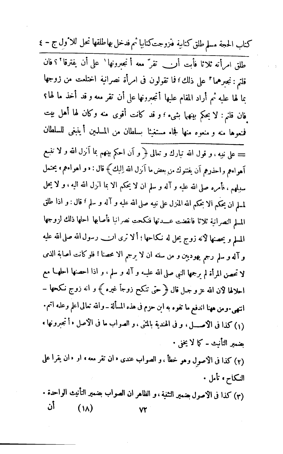 طلق امْرَأَته ثَلَاثًا فَأَبت ان تقر مَعَه أتجبرونها على ان يفترقا فان قُلْتُمْ نجبرهما على ذَلِك فَمَا تَقولُونَ فِي امْرَأَة نَصْرَانِيَّة اخْتلعت من زَوجهَا لما لَهَا عَلَيْهِ ثمَّ اراد الْمقَام عَلَيْهَا اتجبرونها على ان تقر مَعَه وَقد اخذ مَالهَا فان قُلْتُمْ لَا يحكم بَينهمَا بِشَيْء وَقد كَانَت اقوى مِنْهُ وَكَانَ لَهَا اهل بَيت فمنعوها مِنْهُ ومنعوه مِنْهَا فجَاء مستغيثا بسُلْطَان من الْمُسلمين اينبغي للسطان