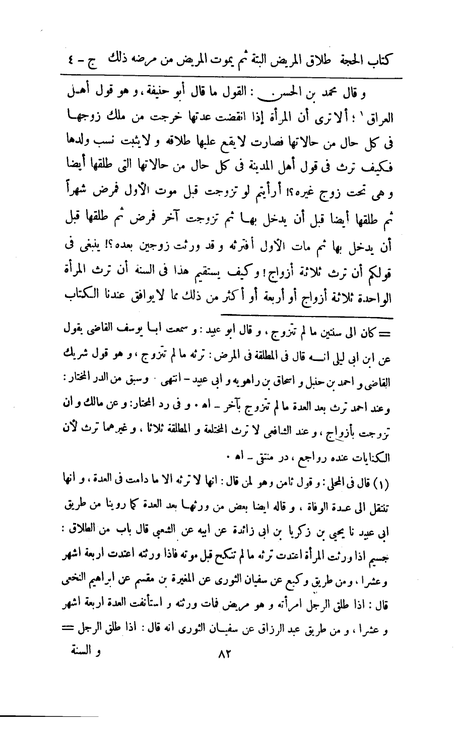 وَقَالَ مُحَمَّد بن الْحسن القَوْل مَا قَالَ ابو حنيفَة وَهُوَ قَول اهل الْعرَاق الا ترى ان المراة اذا انْقَضتْ عدتهَا خرجت من ملك زَوجهَا فِي كل حَال من حالاتها فَصَارَت لَا يَقع عَلَيْهَا طَلَاقه وَلَا يثبت نسب وَلَدهَا فَكيف تَرث فِي قَول اهل الْمَدِينَة فِي كل حَال من حالاتها الَّتِي طَلقهَا ايضا وَهِي تَحت زوج غَيره ارايتم لَو تزوجت قبل موت الاول فَمَرض شهرا ثمَّ طَلقهَا ايضا قبل ان يدْخل بهَا ثمَّ تزوجت اخر فَمَرض ثمَّ طَلقهَا قبل ان يدْخل بهَا ثمَّ مَاتَ الاول فترثه وَقد ورثت زَوْجَيْنِ بعده يَنْبَغِي فِي قَوْلكُم ان تَرث ثَلَاثَة ازواج وَكَيف يَسْتَقِيم هَذَا فِي السّنة ان تَرث المراة الْوَاحِدَة ثَلَاثَة ازواج اَوْ اربعة اَوْ اكثر من ذَلِك مِمَّا لَا يُوَافق عندنَا الْكتاب