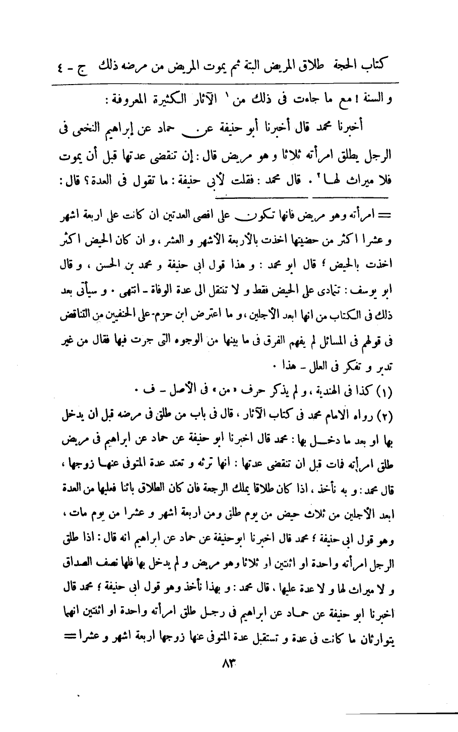 اُخْبُرْنَا مُحَمَّد قَالَ اُخْبُرْنَا ابو حنيفَة عَن حَمَّاد عَن ابراهيم النَّخعِيّ فِي الرجل يُطلق امراته ثَلَاثًا وَهُوَ مَرِيض قَالَ ان تَنْقَضِي عدتهَا قبل ان يَمُوت فَلَا مِيرَاث لَهَا قَالَ مُحَمَّد فَقلت لابي حنيفَة مَا تَقول فِي الْعدة قَالَ