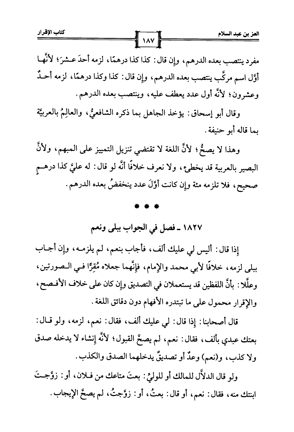 إِذا قال: أليس لي عليك ألف، فأجاب بنعم، لم يلزمه، وإن أجاب ببلى لزمه، خلافًا لأبي محمد والإِمام، فإنَّهما جعلاه مُقِرًّا في الصورتين، وعللا: بأنَّ اللفظين قد يستعملان في التصديق وإن كان على خلاف الأفصح، والإقرار محمول على ما تبتدره الأفهام دون دقائق اللغة.