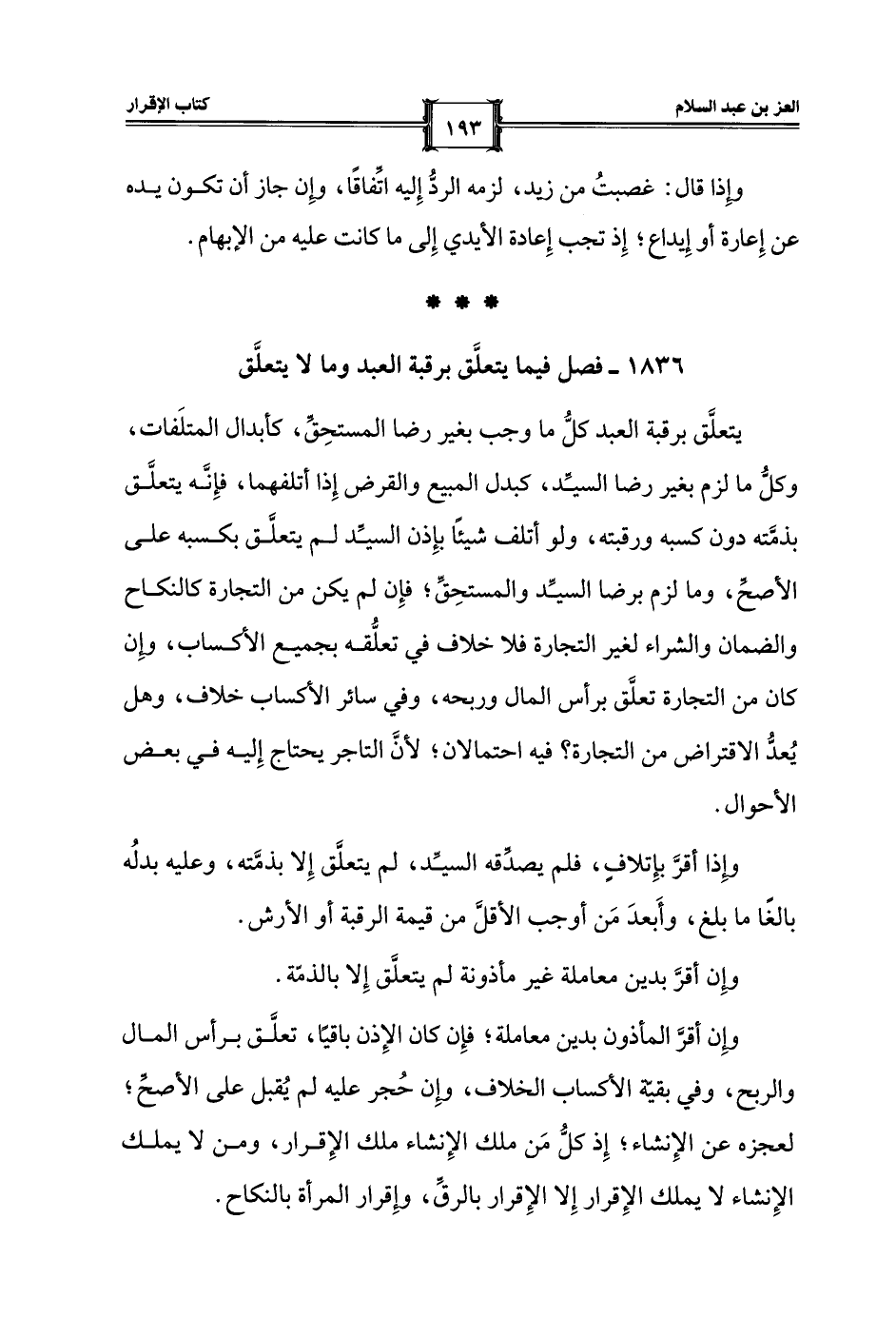 1836 - فصل فيما يتعلَّق برقبة العبد وما لا يتعلَّق