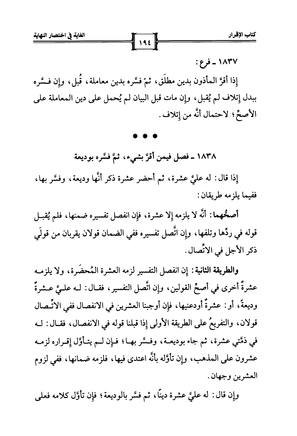 1838 - فصل فيمن أقرَّ بشيء، ثمَّ فسَّره بوديعة
