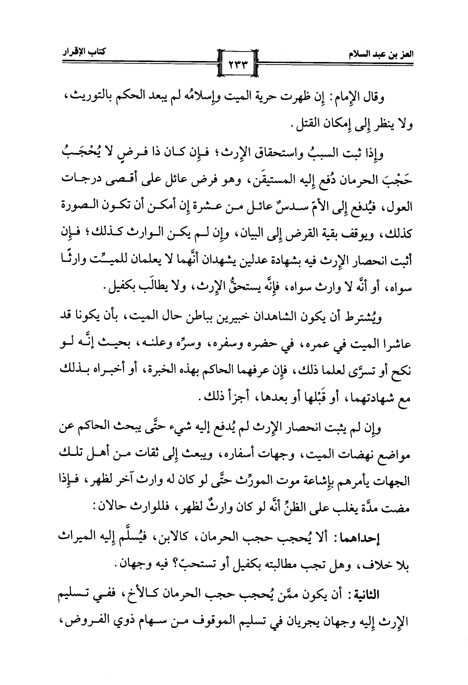 وقال الإِمام: إِن ظهرت حرية الميت وإِسلامُه لم يبعد الحكم بالتوريث، ولا ينظر إِلى إِمكان القتل.