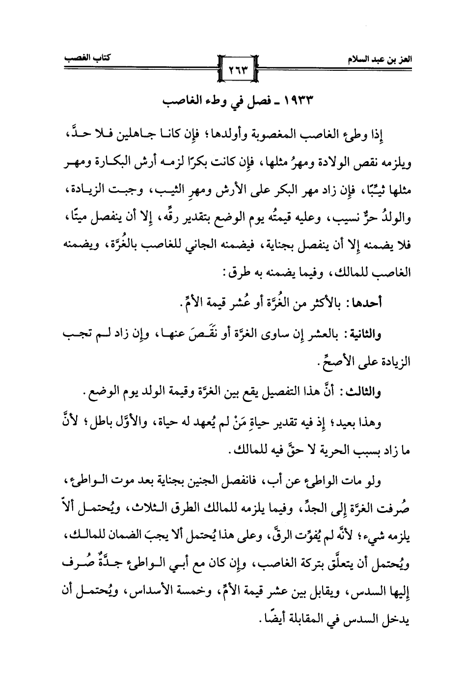 إِذا وطئ الغاصب المغصوبة وأولدها؛ فإِن كانا جاهلين فلا حدَّ، ويلزمه نقص الولادة ومهرُ مثلها، فإِن كانت بكرًا لزمه أرش البكارة ومهر مثلها ثيِّبًا، فإِن زاد مهر البكر على الأرش ومهرِ الثيب، وجبت الزيادة، والولدُ حرٌّ نسيب، وعليه قيمتُه يوم الوضع بتقدير رقِّه، إِلا أن ينفصل ميتًا، فلا يضمنه إِلا أن ينفصل بجناية، فيضمنه الجاني للغاصب بالغُرَّة، ويضمنه الغاصب للمالك، وفيما يضمنه به طرق: