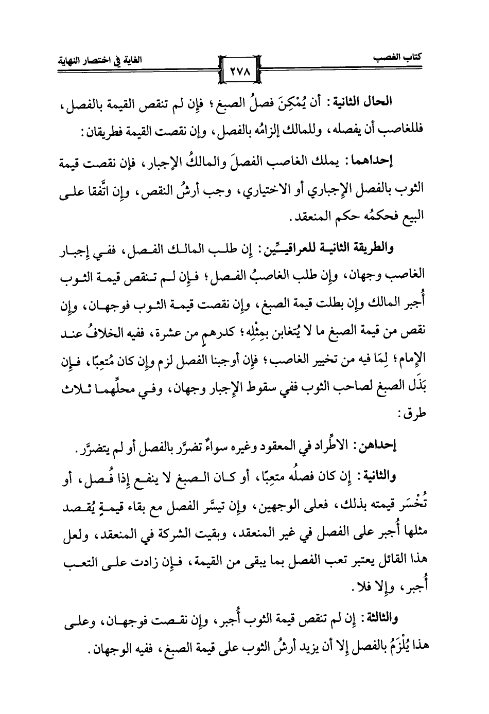 الحال الثانية: أن يُمْكِنَ فصلُ الصبغ؛ فإِن لم تنقص القيمة بالفصل، فللغاصب أن يفصله، وللمالك إلزامُه بالفصل، وإن نقصت القيمة فطريقان: