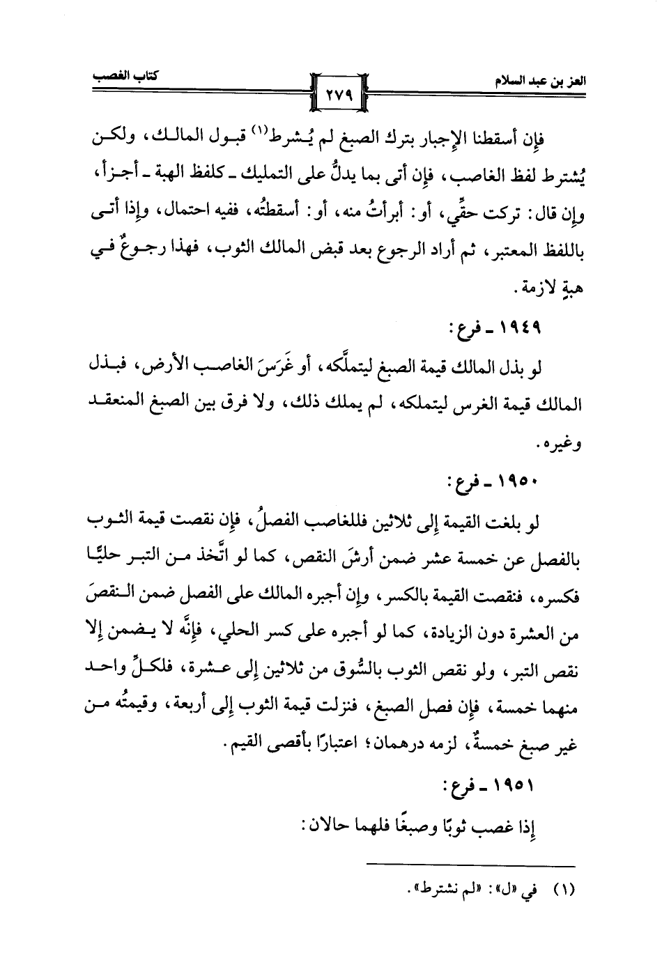 لو بلغت القيمة إِلى ثلاثين فللغاصب الفصلُ، فإِن نقصت قيمة الثوب بالفصل عن خمسة عشر ضمن أرشَ النقص، كما لو اتَّخذ من التبر حليًّا فكسره، فنقصت القيمة بالكسر، وإِن أجبره المالك على الفصل ضمن النقصَ من العشرة دون الزيادة، كما لو أجبره على كسر الحلي، فإِنَّه لا يضمن إِلا نقص التبر، ولو نقص الثوب بالسُّوق من ثلاثين إِلى عشرة، فلكلِّ واحد منهما خمسة، فإِن فصل الصبغ، فنزلت قيمة الثوب إِلى أربعة، وقيمتُه من غير صبغ خمسةٌ، لزمه درهمان؛ اعتبارًا بأقصى القيم.