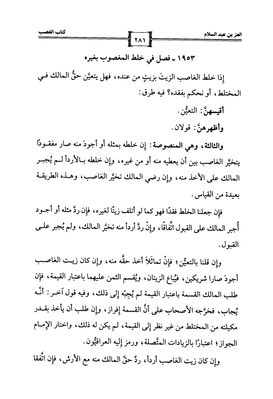 إِذا خلط الغاصب الزيتَ بزيتٍ من عنده، فهل يتعيَّن حقُّ المالك في المختلط، أو نحكم بفقده؟ فيه طرق: