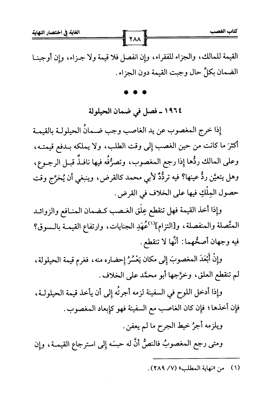 إِذا خرج المغصوب عن يد الغاصب وجب ضمانُ الحيلولة بالقيمة أكثرَ ما كانت من حين الغصب إِلى وقت الطلب، ولا يملكه بدفع قيمته، وعلى المالك ردُّها إِذا رجع المغصوب، وتصرُّفُه فيها نافذٌ قبل الرجوع، وهل يتعيَّن ردُّ عينها؟ فيه تردُّدٌ لأبي محمد كالقرض، وينبغي أن يُخرَّج وقت حصول المِلْكِ فيها على الخلاف في القرض.