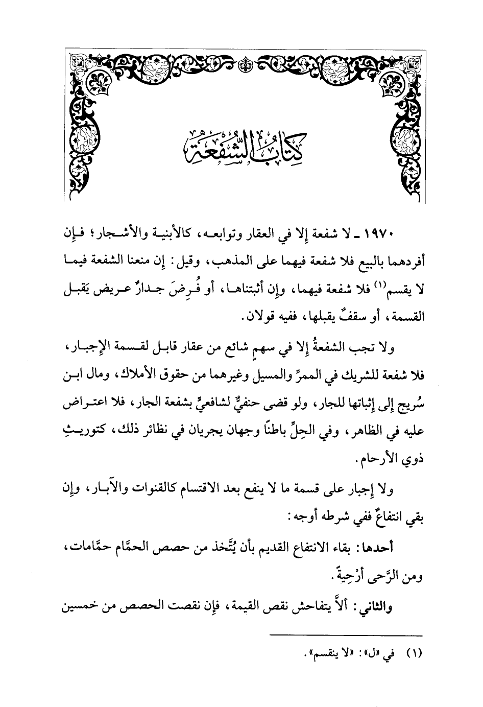 1970 - لا شفعة إِلا في العقار وتوابعه، كالأبنية والأشجار؛ فإِن أفردهما بالبيع فلا شفعة فيهما على المذهب، وقيل: إِن منعنا الشفعة فيما لا يقسم (¬1) فلا شفعة فيهما، وإِن أثبتناها، أو فُرِضَ جدارٌ عريض يَقبل القسمة، أو سقفٌ يقبلها، ففيه قولان.
