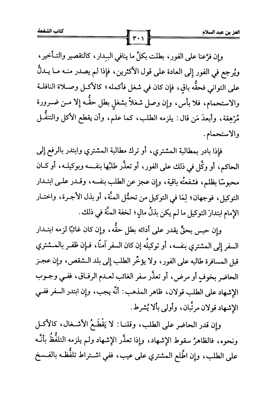 وإِن حبس بحقٍّ يقدر على أدائه بطل حقُّه، وإِن كان غائبًا لزمه ابتدار السفر إِلى المشتري بنفسه، أو توكيلُه إن كان السفر آمنًا، فإِن ظفر بالمشتري قبل المسافرة طالبه على الفور، ولا يؤخِّر الطلب إِلى بلد الشقص، وإِن عجز الحاضر بخوفٍ أو مرض، أو تعذَّر سفر الغائب لعدم الرفاق، ففي وجوب الإشهاد على الطلب قولان، ظاهر المذهب: أنَّه يجب، وإِن ابتدر السفر ففي الإِشهاد قولان مرتَّبان، وأولى بألا يُشرط.