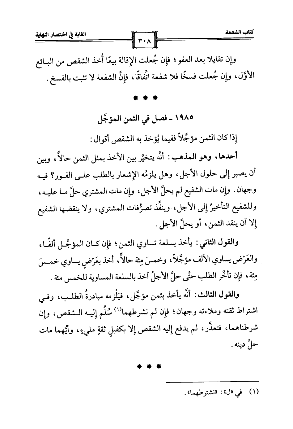 إِذا كان الثمن مؤجَّلًا ففيما يُؤخذ به الشقص أقوال: