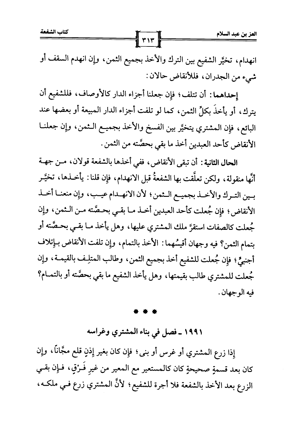 الحال الثانية: أن تبقى الأنقاض، ففي أخذها بالشفعة قولان، من جهة أنَّها منقولة، ولكن تعلَّقت بها الشفعةُ قبل الانهدام، فإِن قلنا: يأخذها، تخيَّر بين الترك والأخذ بجميع الثمن؛ لأن الانهدام عيب، وإِن منعنا أخذ الأنقاض؛ فإِن جُعلت كأحد العبدين أخذ ما بقي بحصَّته من الثمن، وإِن جُعلت كالصفات استقرَّ ملك المشتري عليها، وهل يأخذ ما بقي بحصَّته أو بتمام الثمن؟ فيه وجهان أقيسُهما: الأخذ بالتمام، وإِن تلفت الأنقاض بإِتلاف أجنبيٍّ؛ فإِن جُعلت للشفيع أخذ بجميع الثمن، وطالب المتلِف بالقيمة، وإِن جُعلت للمشتري طالب بقيمتها، وهل يأخذ الشفيع ما بقي بحصَّته أو بالتمام؟ فيه الوجهان.