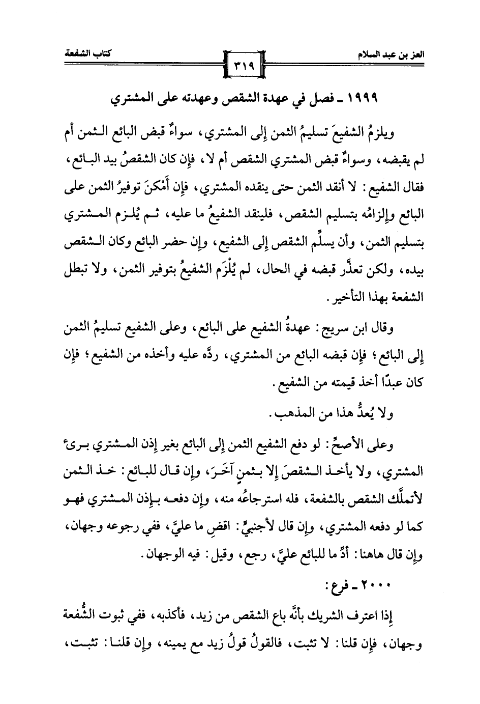 وقال ابن سريج: عهدةُ الشفيع على البائع، وعلى الشفيع تسليمُ الثمن إِلى البائع؛ فإِن قبضه البائع من المشتري، ردَّه عليه وأخذه من الشفيع؛ فإِن كان عبدًا أخذ قيمته من الشفيع.