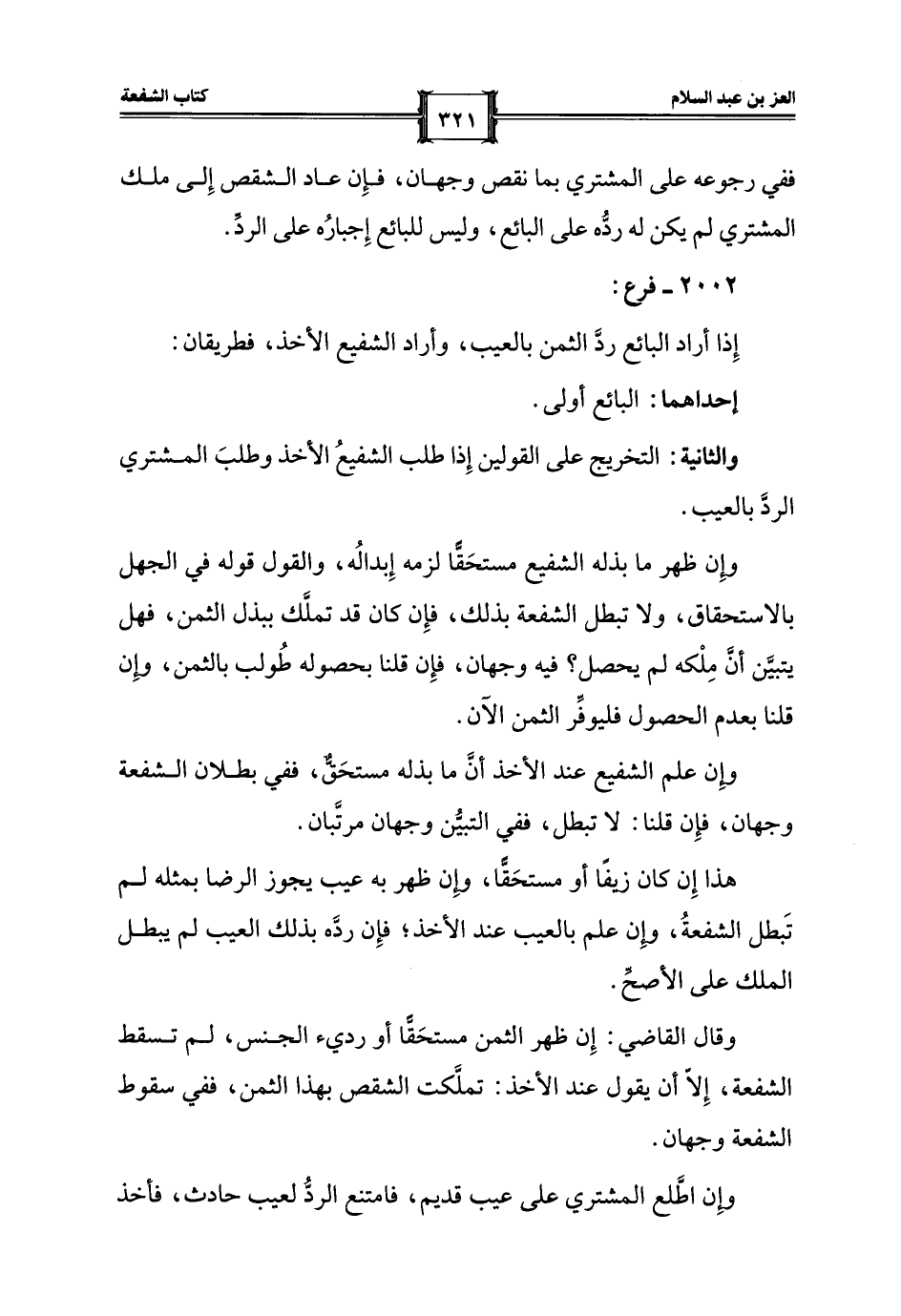 والثانية: التخريج على القولين إِذا طلب الشفيعُ الأخذ وطلبَ المشتري الردَّ بالعيب.