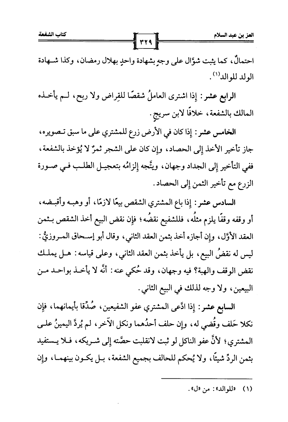 الخامس عشر: إِذا كان في الأرض زرع للمشتري على ما سبق تصويره، جاز تأخير الأخذ إِلى الحصاد، وإِن كان على الشجر ثمرٌ لا يُؤخذ بالشفعة، ففي التأخير إِلى الجداد وجهان، ويتَّجه إِلزامُه بتعجيل الطلب في صورة الزرع مع تأخير الثمن إِلى الحصاد.
