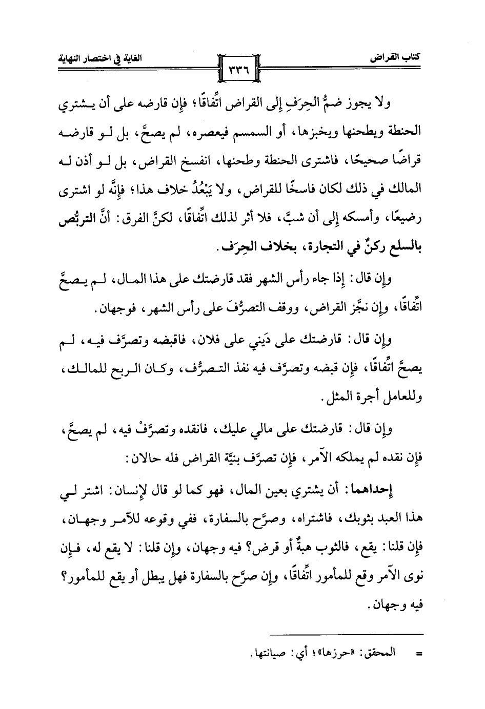 ولا يجوز ضمُّ الحِرَفِ إِلى القراض اتِّفاقًا؛ فإِن قارضه على أن يشتري الحنطة ويطحنها ويخبزها، أو السمسم فيعصره، لم يصحَّ، بل لو قارضه قراضًا صحيحًا، فاشترى الحنطة وطحنها، انفسخ القراض، بل لو أذن له المالك في ذلك لكان فاسخًا للقراض، ولا يَبْعُدُ خلاف هذا؛ فإِنَّه لو اشترى رضيعًا، وأمسكه إِلى أن شبَّ، فلا أثر لذلك اتِّفاقًا، لكنَّ الفرق: أنَّ التربُّص بالسلع ركنٌ في التجارة، بخلاف الحِرَف.